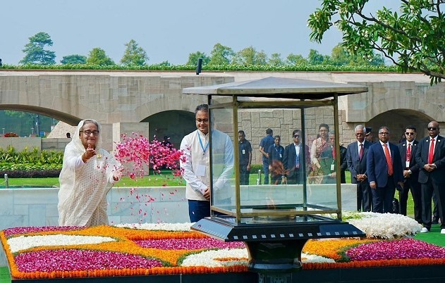 Prime Minister Sheikh Hasina paid tribute to Mahatma Gandhi, the father of the Indian nation, on Saturday by placing a